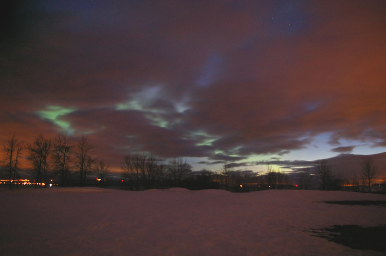 This aurora borealis with purple colors over St-Vallier near to Quebec city Canada captured in april 9 2006 at 4 h 40 am after a painful hunting through a very cloudy night Pentax istDS lens 18mmGilles Boutin Lévis Québec Canada |