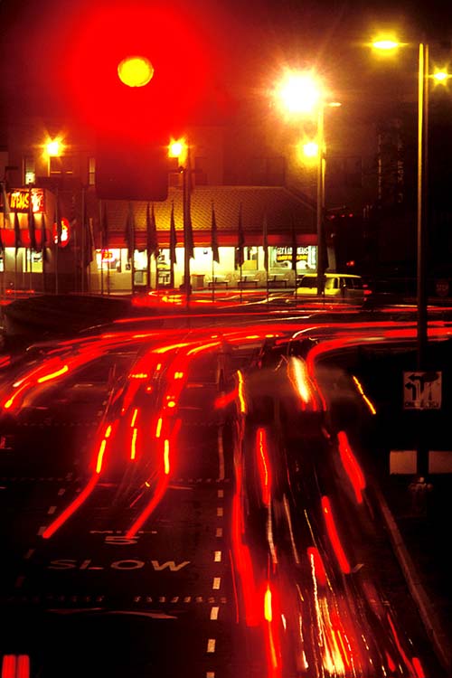 Fujichrome 100. Light streaks caused by a bus passing through the scene.