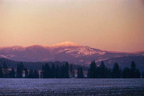 This is Mt. Spokane and the foot hills surrounding Peone Prairie where I live. My family came here in the 1880's and homesteaded in the area. The mountain is about 5800' and the Idaho panhandle is just beyond. I took this photo a couple miles up the road from home. The mountains turn pink at sunset in winter if it is clear. It's pretty, but gets very cold on clear nights. brrrrr