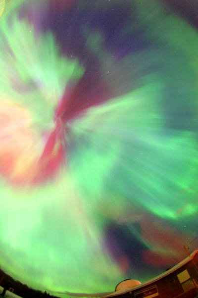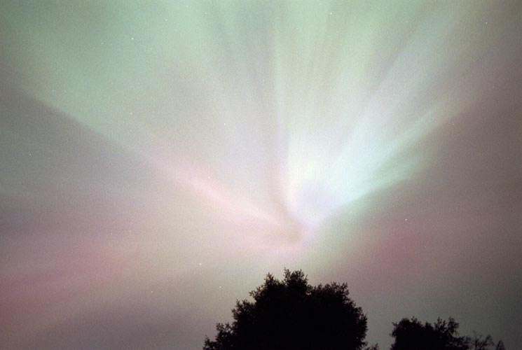 This photo of an aurora corona was taken at Hutch Lake near High Level, Alberta on 3/9/04. Photo details: Fuji 800, 24 mm, f 1.8, exposed for 30 seconds. See more photos by: John Sandy - Deer Park, Washington |