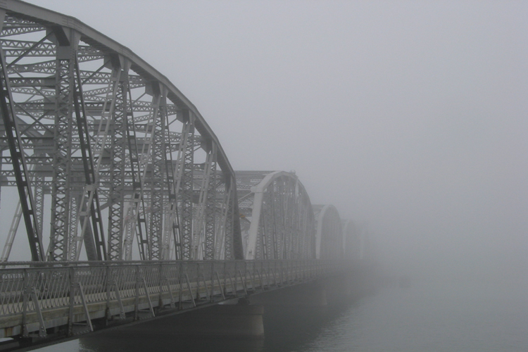 "The Michigan Street bridge fading into dense fog in Sturgeon Bay, WI. Looking out over the Bay on the Door County Peninsula, it was difficult to tell where the water stopped and the sky began. Taken with a Canon G2 digital."