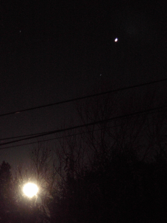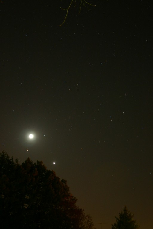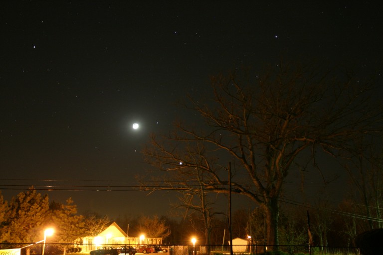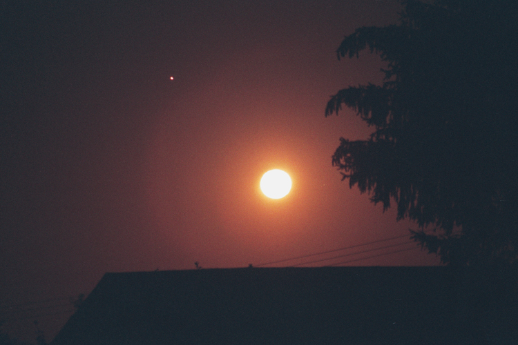 On the morning of Sept. 10th 2003, I shot this beautiful picture of mars chasing a bright orange moon to the horizon. Awesome! Pentax k1000, sigma 70-210mm (at 210mm f/5.6),