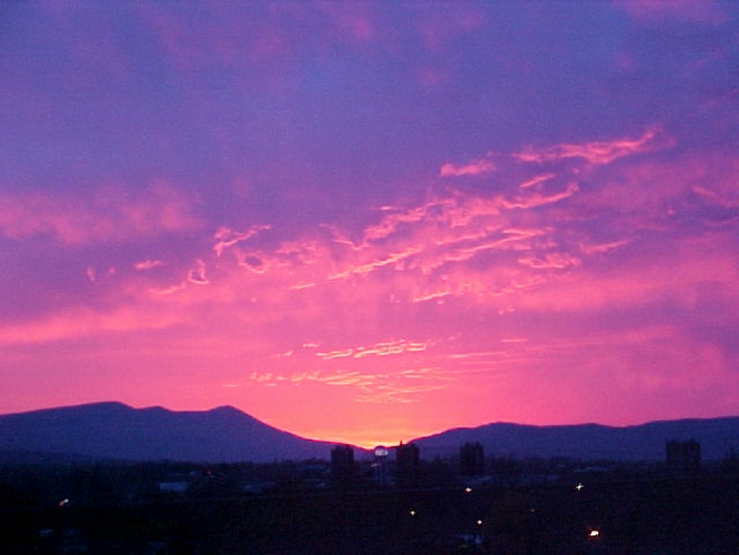 The hill behind our house blocks our view to the Westernhorizon and makes viewing dramatic sunsets a rarity from our vantage point. But on some evenings there's just too much sunset and, much to our delight, it spills over into our valley. 8-27-02 Camera: Olympus C-700 Digital on Auto setting, ISO 100. e-mail to: Karl J. Kuehn - Greene, NY |