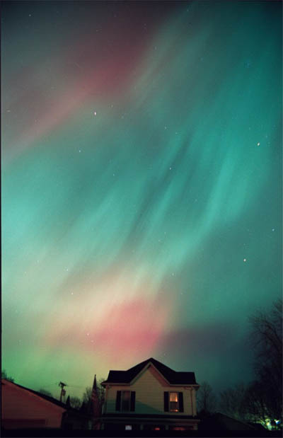 An awesome display of aurora on the night of November 7th. The sky was just covered with pulsing waves, starting in the north, spreading across from the east to the west. Here above my house is an incredible display of reds and greens.See more photos by: William Biscorner - Memphis, Michigan |