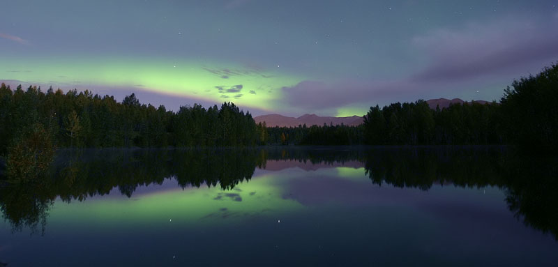 the spectacular northern lights reflecting in an Anchorage, Alaska lake,