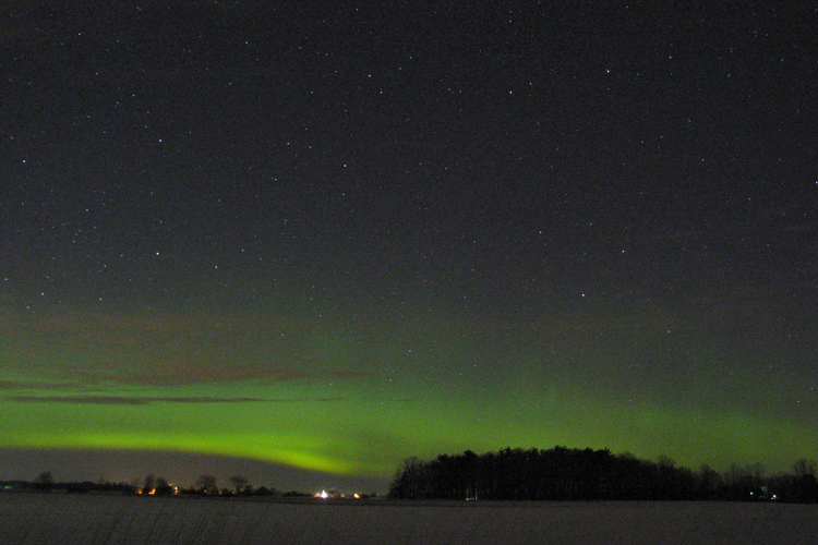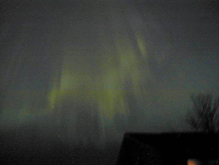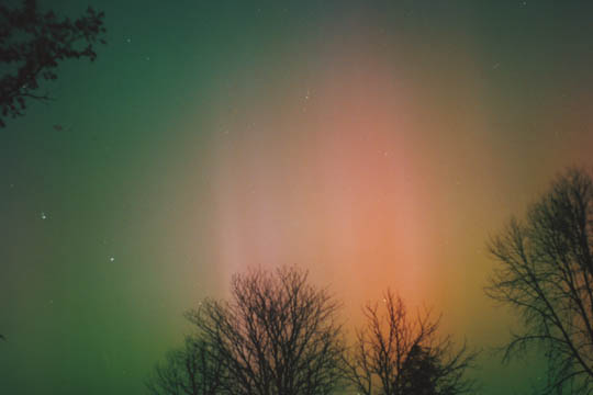 2004/01/25 brief auroral display at 01:00. The temp was around 0 degrees in Two Rivers, WI. This bright curtain shot across the horizon, and faded again 15 minutes later. I was lucky enough to be driving through a rural area with a camera & tripod handy. Canon G2 digital, ASA 400, f 2.0 for 15 sec.See more photos by: Peg Zenko |