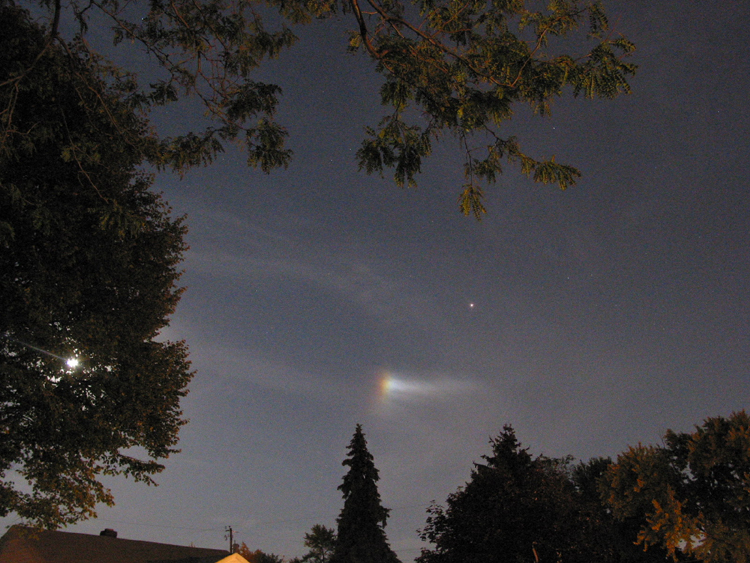 Venus during sunset over Portage Lake in Pinckney, Michigan."The orange stripe going 4/5 the way across the photo from left to right is the running lights on a pontoon boat crossing the lake." Pentax 35mm on Kodak Royal Gold 400 color print film. 30 sec exp e-mail to: Mike Hutchinson - Muncie, Indiana |